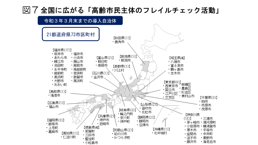 - 주민 참여형 예방 활동: 건강한 고령자가 '프레일 서포터'가 되어 다른 고령자들의 건강 체크와 상담을 담당합니다. 이를 통해 고령자의 사회 참여도 촉진됩니다.